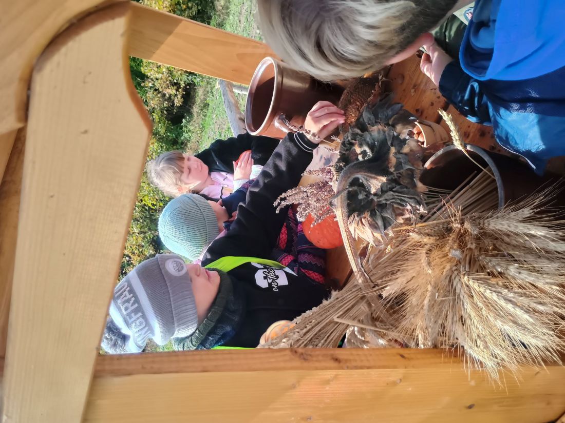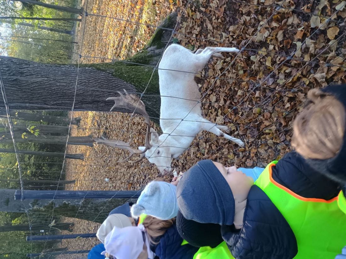 Następnie uczniowie udali się na spacer ścieżką edukacyjną, dzięki której poznali lecznicze właściwości niektórych drzew. Kolejnym punktem programu było karmienie zwierząt w mini zoo, co dostarczyło dzieciom wielu emocji. Niektórzy uczniowie pokonali swoje lęki i po raz pierwszy mieli bliski kontakt ze zwierzętami. Dzieci mogły karmić daniele, obserwować kolorowe papugi, podziwiać pawia oraz niezwykłego bażanta bananowego. Spotkanie ze zwierzętami sprawiło wszystkim ogromną radość. Później przyszedł czas na warsztaty kulinarne. Uczniowie samodzielnie przygotowywali ciasteczka, wycinając z ciasta jesienne kształty. Gdy wypieki trafiły do piekarnika, dzieci udały się na farmę dyniową, gdzie czekało na nie wiele atrakcji. Podziwiały różne gatunki i odmiany dyń, jabłek, cukinii, zbóż i ziół – wszystkie pięknie opisane i ułożone w malownicze kompozycje. Duże wrażenie zrobiły także ogromne postacie i zwierzęta wykonane ze słomy, które wprowadziły wszystkich w bajkowo-jesienny nastrój. W ich otoczeniu dzieci spędziły miło czas na wspólnych zabawach i pląsach.