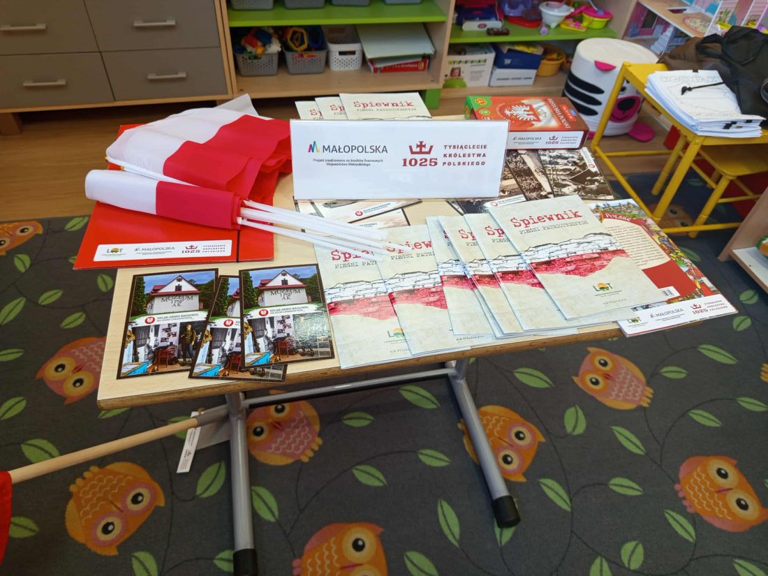 W trakcie spotkania nastąpiło również przekazanie materiałów edukacyjnych dla szkoły w ramach projektu. Placówka otrzymała m.in. grę patriotyczną „Mini Quiz Historia Polski”, śpiewniki patriotyczne, 10 sztuk biało-czerwonych chorągiewek, 5 rodzajów pocztówek historycznych o lokalnym kontekście historycznym oraz książkę „Kocham Polskę. Elementarz małego Polaka”. Dodatkowo szkoła została wyposażona w gotowy konspekt zajęć patriotycznych dla nauczycieli, uchwyt flagowy, jednoramienny maszt oraz Flagę Narodową z drzewcem.