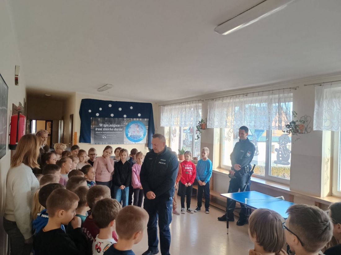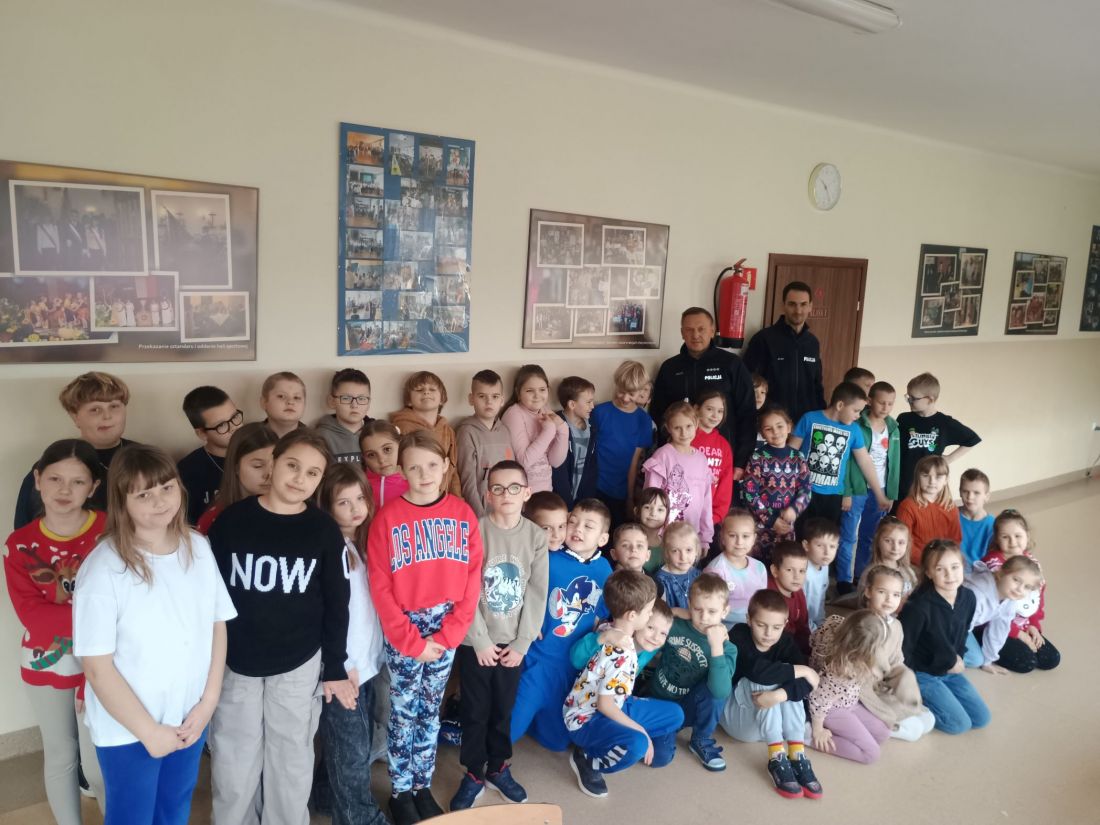 16 grudnia 2025 roku uczniowie klas I–VII uczestniczyli w spotkaniu z panem policjantem z Posterunku Policji w Łukowicy. Celem spotkania było zwrócenie uwagi na bezpieczeństwo dzieci i młodzieży poruszających się po drogach – zarówno pieszo, jak i na rowerach oraz hulajnogach. Podczas rozmowy policjant przypomniał podstawowe zasady bezpiecznego poruszania się po jezdni i chodnikach, omówił obowiązujące przepisy oraz najczęstsze zagrożenia, z jakimi mogą spotkać się uczniowie w drodze do szkoły i poza nią. Szczególną uwagę zwrócono na znaczenie elementów odblaskowych i kamizelek, które znacznie poprawiają widoczność i mogą uratować zdrowie, a nawet życie. Uczniowie dowiedzieli się, jak ważne jest dostosowanie prędkości do warunków na drodze, unikanie korzystania z telefonu podczas jazdy oraz noszenie kasków ochronnych. Spotkanie miało charakter profilaktyczny i było okazją do zadawania pytań oraz dzielenia się własnymi doświadczeniami. Zdobyta wiedza z pewnością przyczyni się do zwiększenia bezpieczeństwa uczniów w codziennych sytuacjach.