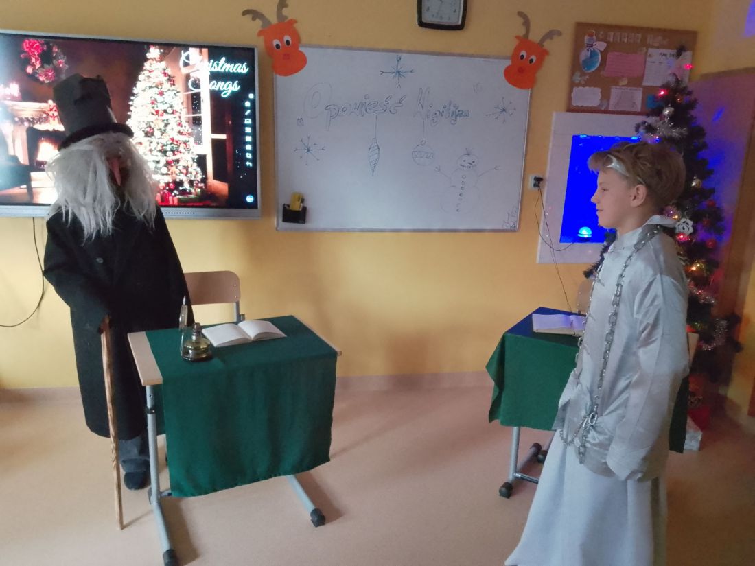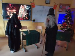 Uczniowie z dużym zaangażowaniem i samodzielnością przygotowali całe przedsięwzięcie – opracowali scenariusz, stworzyli nastrojową scenografię, zadbali o odpowiednie kostiumy oraz oprawę muzyczną, która doskonale podkreślała klimat przedstawienia. Całość wprowadziła widzów w prawdziwie bożonarodzeniowy nastrój, pełen refleksji i wzruszeń. Występ przypomniał ważne przesłanie lektury – że każdy człowiek ma szansę na przemianę, a empatia, dobroć i wrażliwość na potrzeby drugiego człowieka są wartościami ponadczasowymi. Historia Ebenezera Scrooge’a stała się dla młodych aktorów i widzów okazją do zastanowienia się nad tym, co w życiu naprawdę ważne.