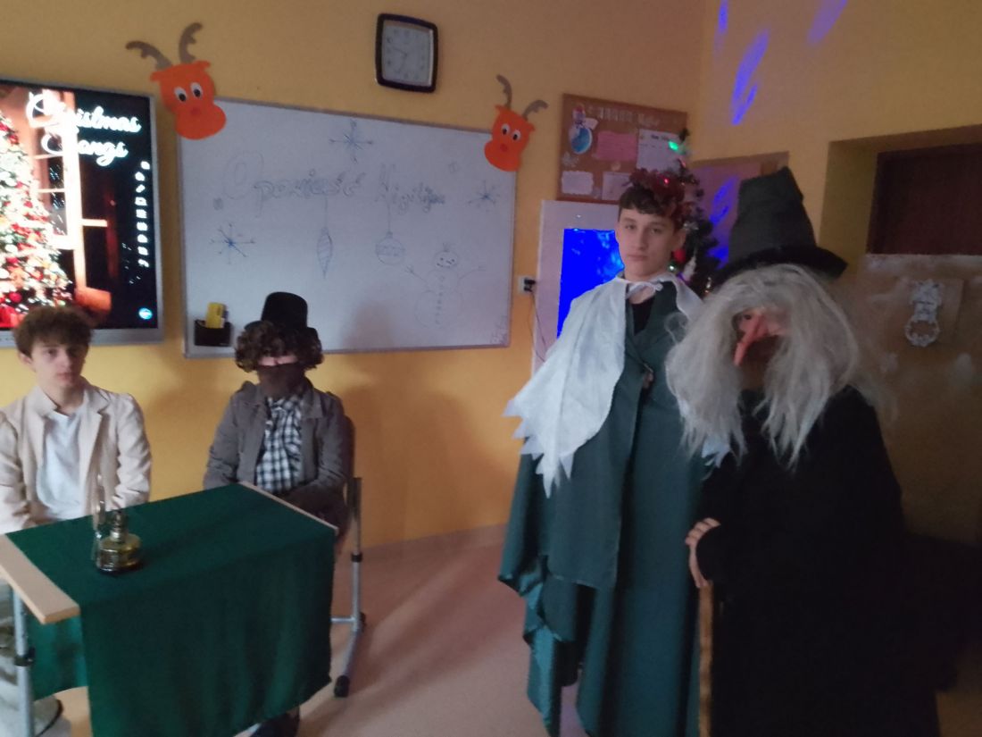 18 grudnia 2025 roku uczniowie klasy 7 zaprezentowali świąteczne przedstawienie oparte na motywach lektury „Opowieść wigilijna” Charlesa Dickensa. Wydarzenie było podsumowaniem realizowanego w klasie polonistycznego projektu edukacyjnego „Od obojętności do dobroci – śladami Opowieści wigilijnej”.