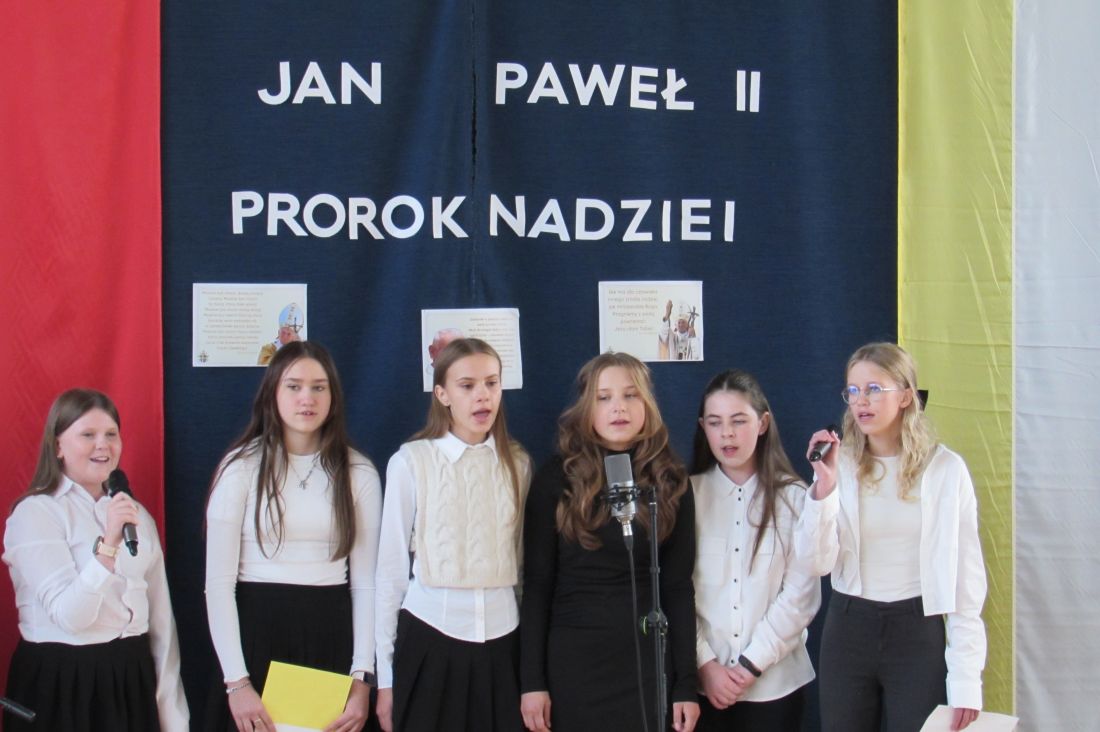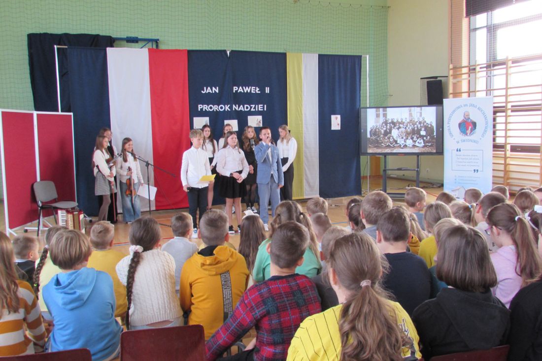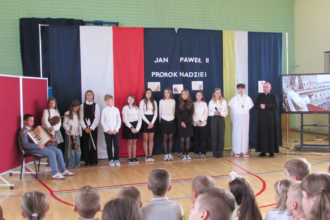 We czwartek, 16 października 2025 r., w naszej szkole obchodziliśmy XXV Dzień Papieski, którego tegorocznym hasłem było: „Św. Jan Paweł II – Prorok Nadziei”. Z tej okazji w sali gimnastycznej odbyła się uroczystość przygotowana przez uczniów klas VI-VIII.. Młodzież zaprezentowała wzruszające przedstawienie, w którym poprzez słowo i muzykę przybliżyła najważniejsze momenty pontyfikatu św. Jana Pawła II. Występ był pięknym przypomnieniem o jego przesłaniu pełnym wiary, nadziei i miłości, które do dziś pozostaje aktualne.