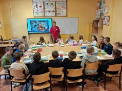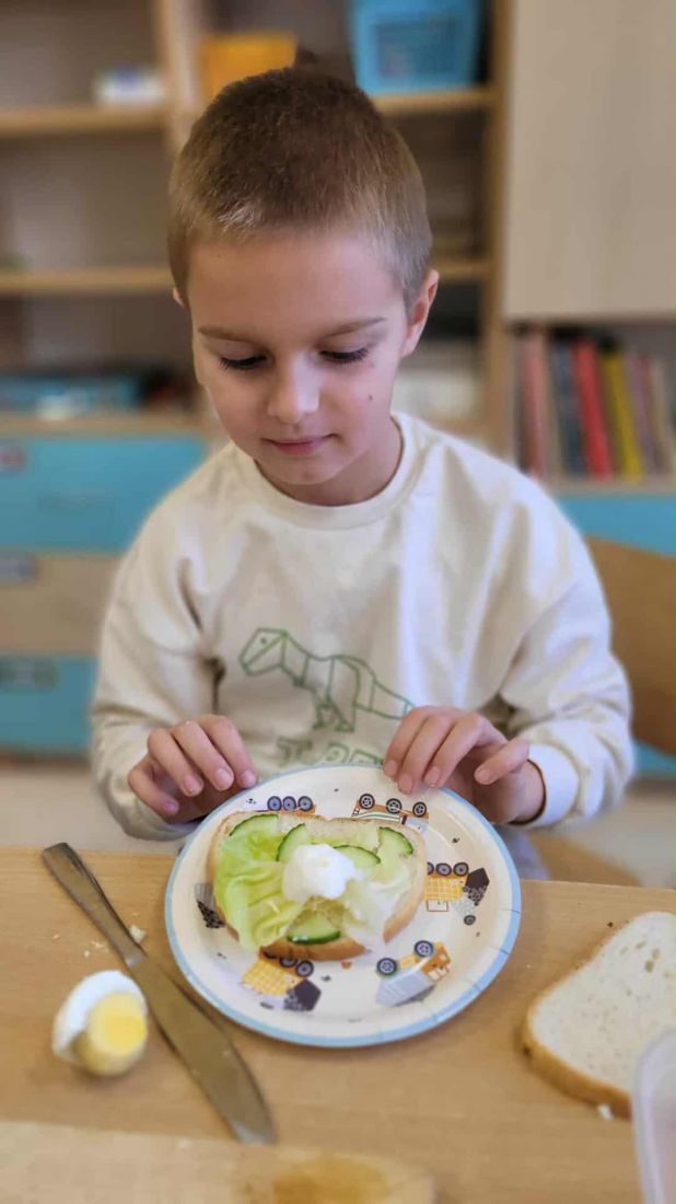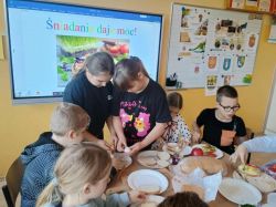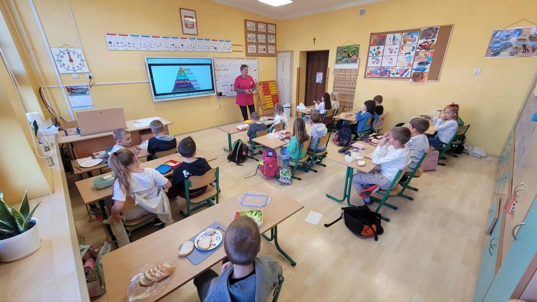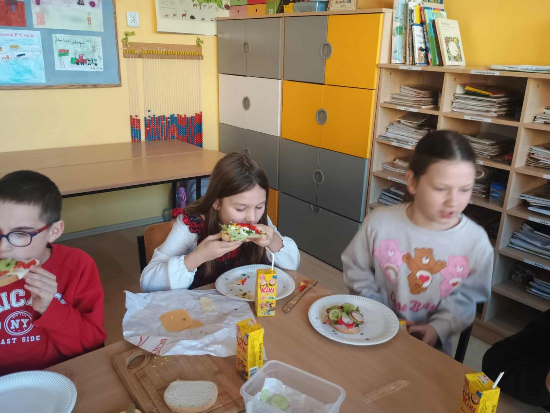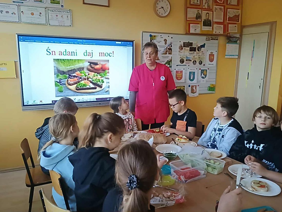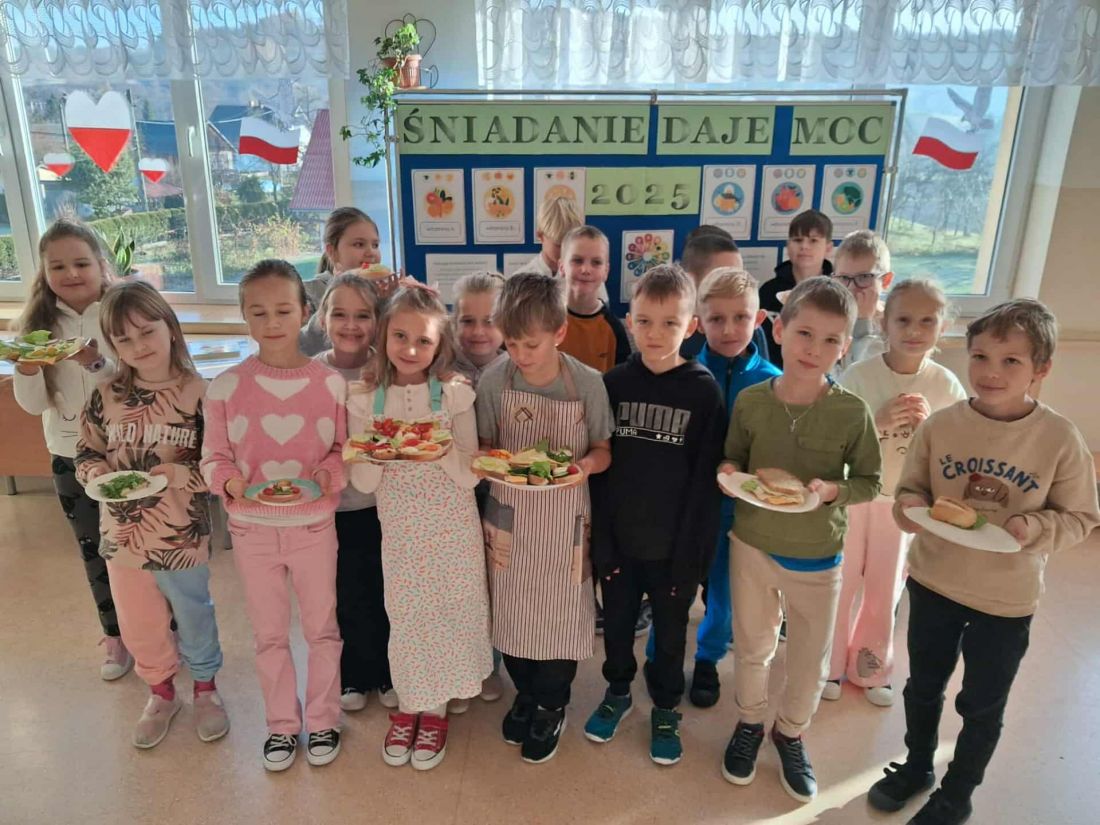 14 listopada 2025 roku w naszej szkole odbyła się specjalna akcja edukacyjna dla uczniów klas 0–3 pod hasłem „Śniadanie daje moc”. Celem wydarzenia było uświadomienie dzieciom, jak ważną rolę w codziennym funkcjonowaniu odgrywa zdrowe i pełnowartościowe śniadanie. Na początku zajęć uczniowie spotkali się z panią pielęgniarką i wysłuchali krótkiej pogadanki na temat zasad prawidłowego odżywiania. Poznali najważniejsze grupy produktów oraz dowiedzieli się, w jaki sposób wpływają one na energię, koncentrację i dobre samopoczucie w ciągu dnia. Następnie dzieci przystąpiły do praktycznej części zajęć. Każdy uczeń przyniósł ze sobą zdrowe produkty – warzywa, owoce, pełnoziarniste pieczywo i nabiał. Z wykorzystaniem tych składników uczniowie samodzielnie przygotowywali swoje śniadania, komponując kolorowe i wartościowe kanapki. Była to świetna okazja do rozwijania samodzielności, kreatywności i umiejętności współpracy. W klasach panowała radosna atmosfera, a dzieci z dużym zaangażowaniem uczestniczyły w całej akcji. Wspólne przygotowywanie posiłku nie tylko uświadomiło im, jak ważne jest zdrowe jedzenie, ale także pokazało, że przygotowanie wartościowego śniadania może być proste i przyjemne. Było to bardzo udane wydarzeniem, które połączyło naukę z praktyką i dobrą zabawą. Uczniowie zdobyli cenną wiedzę, a jednocześnie nauczyli się dbać o siebie i swoje codzienne nawyki żywieniowe. To ważny krok w kierunku kształtowania zdrowego stylu życia już od najmłodszych lat.