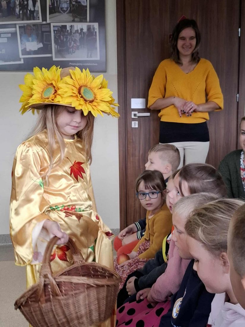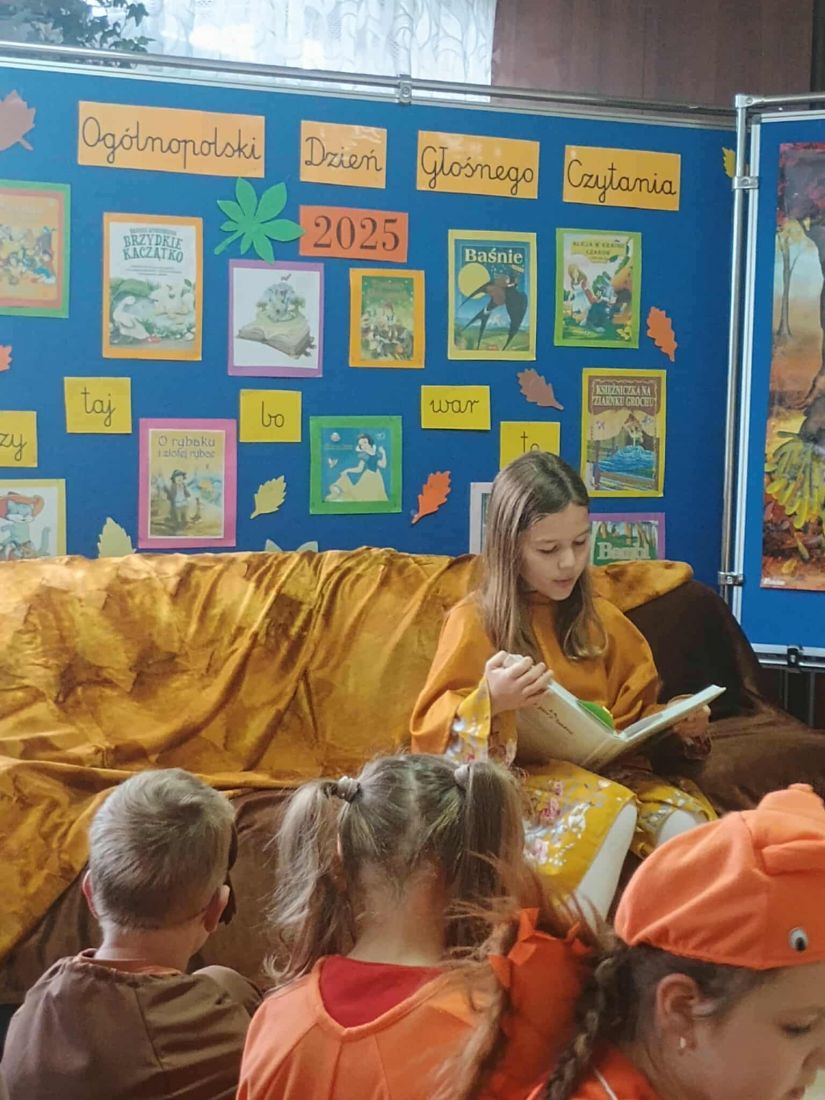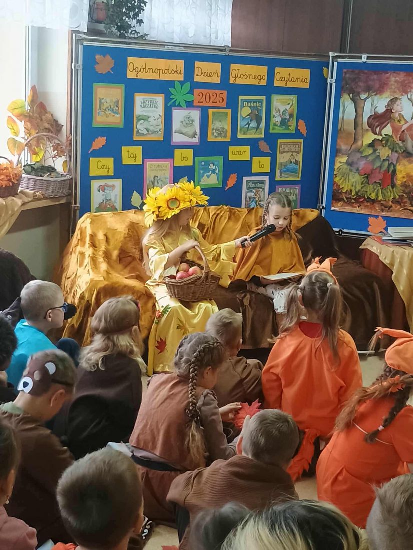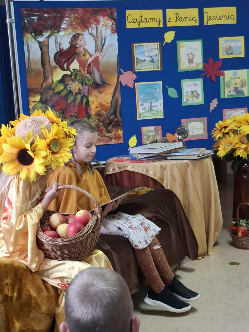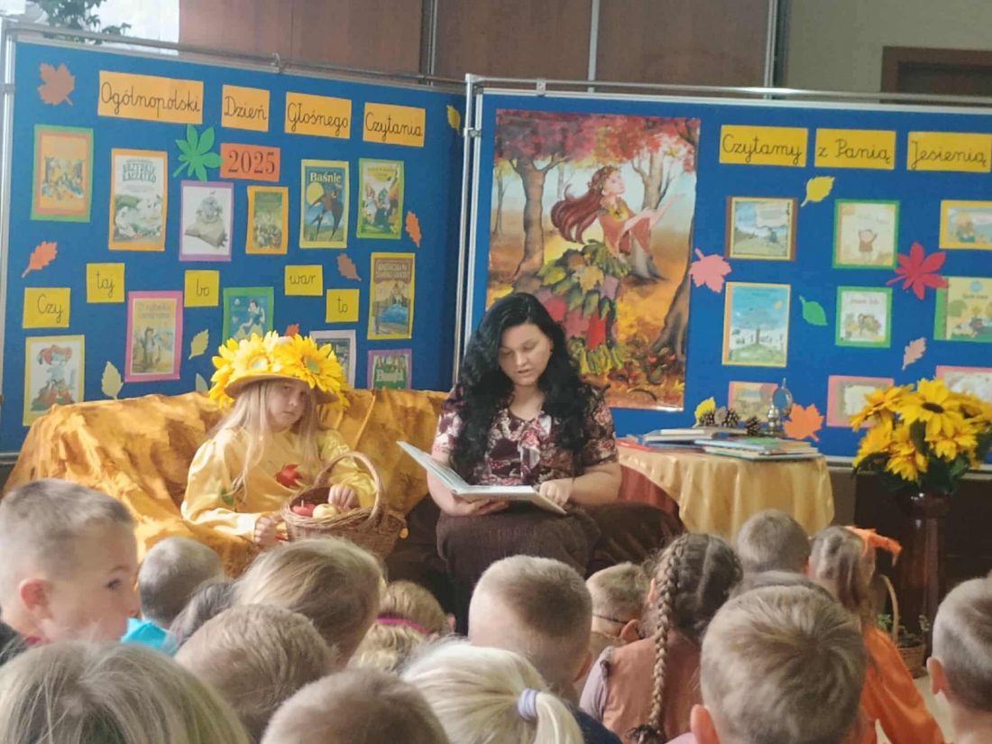 Po części artystycznej uczniowie klas I–III wzięli udział w uroczystym czytaniu. Każda klasa przygotowała opowiadania o tematyce jesiennej. Po przeczytanych tekstach dzieci zadawały pytania, sprawdzając uważność słuchaczy. Pani Jesień nagradzała poprawne odpowiedzi pysznymi, soczystymi jabłuszkami, które były symbolem zdrowia i obfitości tej pory roku. W uroczystości wzięła udział także mama jednej z uczennic klasy drugiej pani Beata Łabuz, która w niezwykle piękny sposób przeczytała jesienne opowiadanie. Uśmiechy na twarzach dzieci świadczyły o tym, jak bardzo cieszyły się z takiej formy zabawy i nauki.