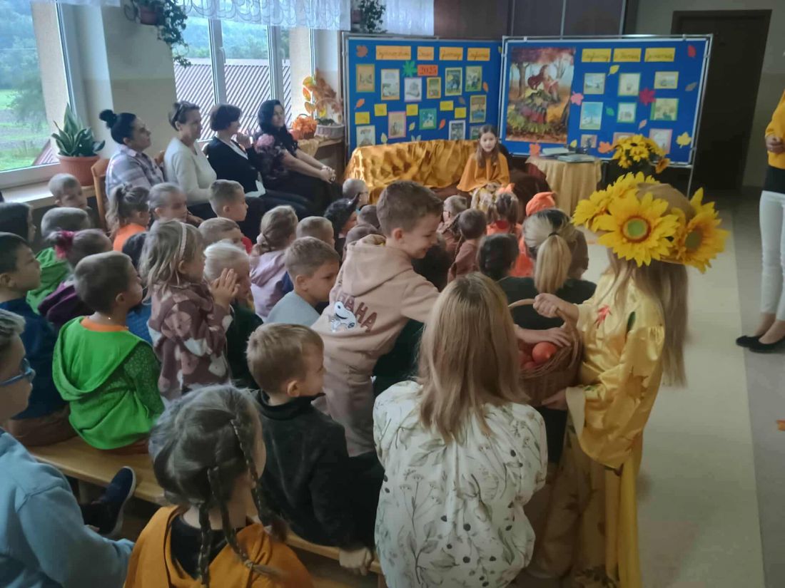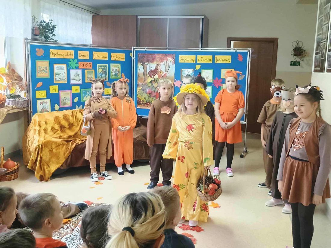 30 września 2025 r.w naszej szkole odbyło się wyjątkowe spotkanie z Panią Jesienią. Uroczystość rozpoczęło koło teatralne uczniów klasy drugiej, prowadzone przez panią Władysławę Sułkowską. Dzieci pięknie zaśpiewały piosenkę o Pani Jesieni, a następnie zaprezentowały krótki spektakl. Na scenie pojawiły się barwne postacie – jesienne zwierzątka, w które uczniowie wcielili się z ogromnym zaangażowaniem. Kolorowe stroje, wiersze i radosne piosenki wprowadziły wszystkich w niezwykły, jesienny nastrój.