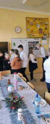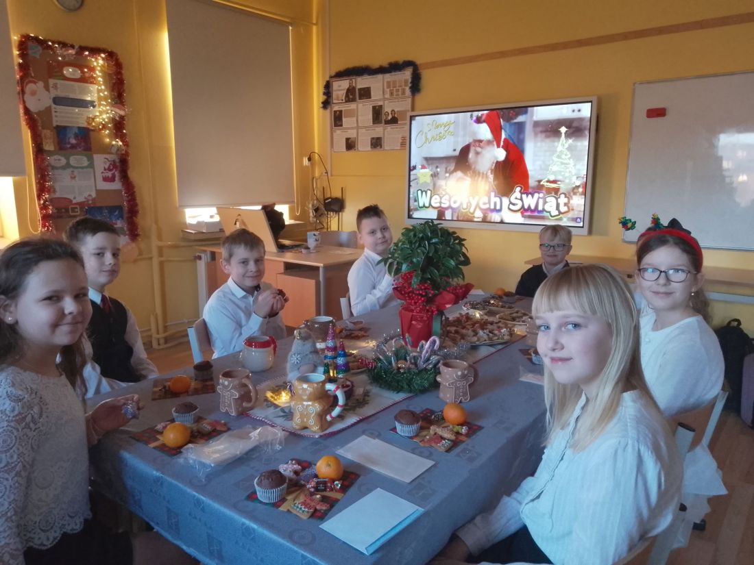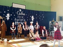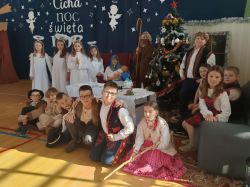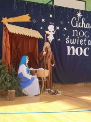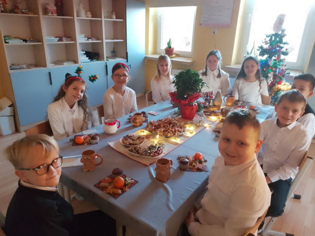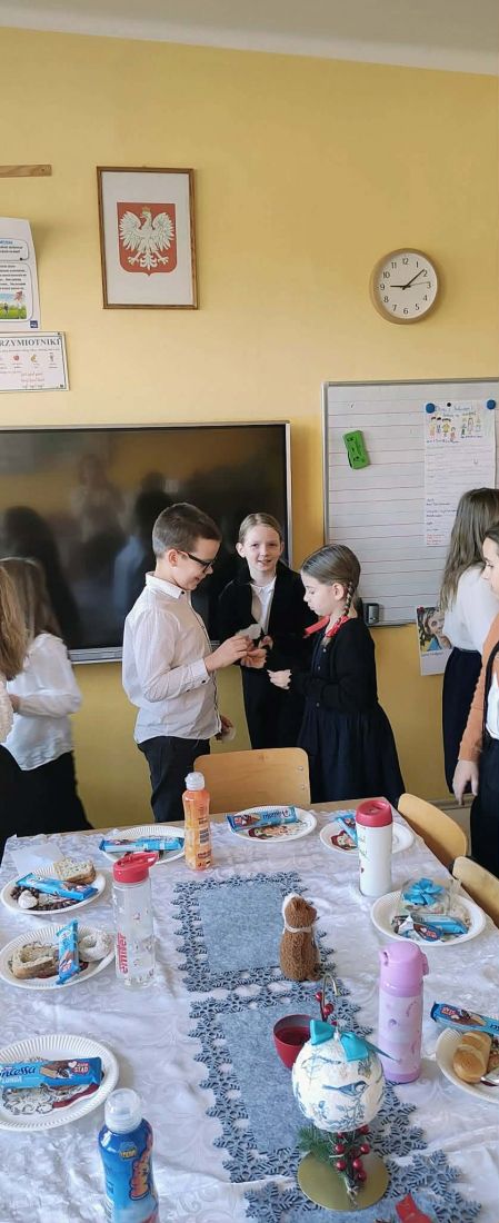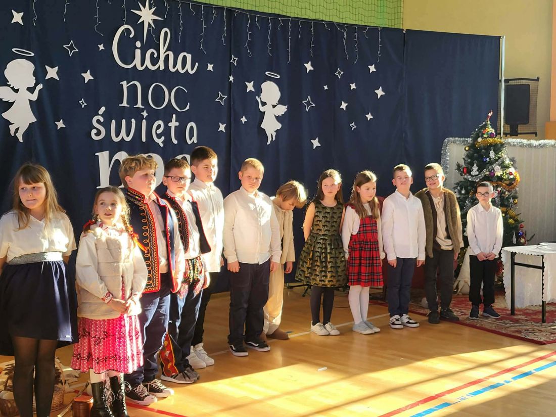 O godzinie 11.00 cała społeczność szkolna wraz z zaproszonymi gośćmi spotkała się w sali gimnastycznej, aby wspólnie rozpocząć dalsze świętowanie. Uroczystość otworzyło piękne, świąteczne przedstawienie przygotowane przez uczniów klasy 3, które wprowadziło wszystkich w bożonarodzeniowy nastrój. Następnie ksiądz Andrzej odczytał fragment Ewangelii opowiadający o narodzeniu Pana Jezusa oraz skierował do zebranych ciepłe, pełne nadziei życzenia świąteczne. Do życzeń dołączyła również Pani Dyrektor, która podziękowała uczniom i nauczycielom za całoroczny trud oraz życzyła wszystkim spokojnych, rodzinnych Świąt Bożego Narodzenia i pomyślności w nadchodzącym roku.