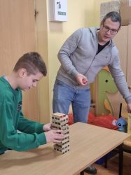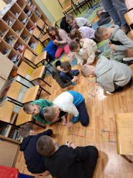 Kolejną grupą była klasa III, realizująca temat: „Słowa mają moc”. Uczniowie pracowali metodą praktyczną, budując wieże „yang”, wykorzystując klocki opisane słowami miłymi i niemiłymi. Ćwiczenie to stało się punktem wyjścia do rozmów o tym, jak słowa mogą ranić, ale także jak mogą wzmacniać, wspierać i budować relacje. Dzieci dzieliły się własnymi doświadczeniami, uczyły się rozpoznawać emocje związane z komunikacją oraz zastanawiały się, jakie słowa warto wybierać w codziennych relacjach z innymi.