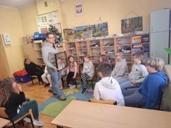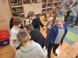 Pierwszą grupą uczestniczącą w warsztatach byli uczniowie klasy II, którzy realizowali temat: „Budowanie relacji w zespołach klasowych w warunkach edukacji stacjonarnej”. Zajęcia rozpoczęły się od ćwiczenia z zakresu autoprezentacji – każde dziecko przedstawiało się, opowiadało o swoich marzeniach oraz o tym, co lubi robić w wolnym czasie. Był to ważny element integrujący grupę oraz budujący poczucie bezpieczeństwa. We wstępie uczniowie zostali zaproszeni do rozwiązania zagadki – mieli zajrzeć pod ukryty obraz, wiedząc, że zobaczą tam „fajną osobę”. Ku ich zaskoczeniu okazało się, że pod obrazem znajdowało się lustro. Ćwiczenie to w znaczący sposób wpłynęło na wzmocnienie samooceny uczniów, uświadamiając im ich wartość i wyjątkowość. Kolejnym elementem były ćwiczenia rozwijające współpracę, m.in. tworzenie „rąk jako pajęczyny” i wspólne planowanie jej ułożenia za pomocą rozmowy i porozumienia. Następnie przeprowadzono ćwiczenie „minuta ciszy”, podczas którego dzieci mogły doświadczyć, jak cisza wpływa na emocje i wyciszenie organizmu. Był to istotny element nauki radzenia sobie ze złością i napięciem emocjonalnym. W trakcie zajęć pojawiła się również bajka terapeutyczna, ukazująca, że rozmowa i dzielenie się przeżywanymi trudnymi emocjami jest formą pomocy i wsparcia.