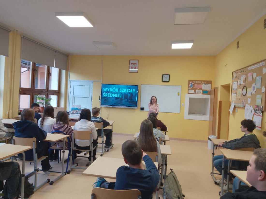 Spotkanie miało charakter aktywny – uczniowie chętnie uczestniczyli w dyskusji, dzielili się swoimi doświadczeniami i refleksjami, a także zadawali pytania. Dzięki temu zajęcia były nie tylko źródłem wiedzy, ale również okazją do wymiany poglądów i rozwijania świadomości dotyczącej przyszłości edukacyjnej. Udział w spotkaniu z doradcą zawodowym z Młodzieżowego Centrum Kariery z pewnością przyczynił się do lepszego przygotowania uczniów do podjęcia jednej z pierwszych ważnych decyzji w ich życiu – wyboru dalszej drogi kształcenia.