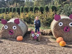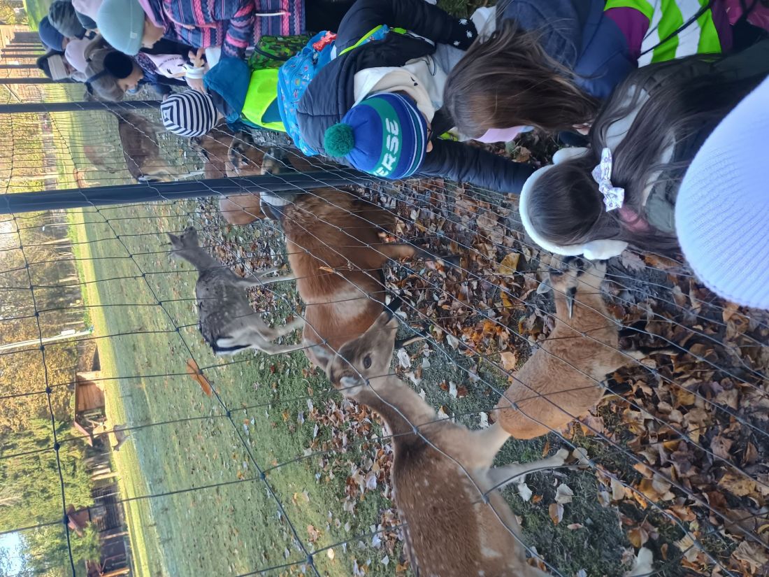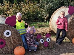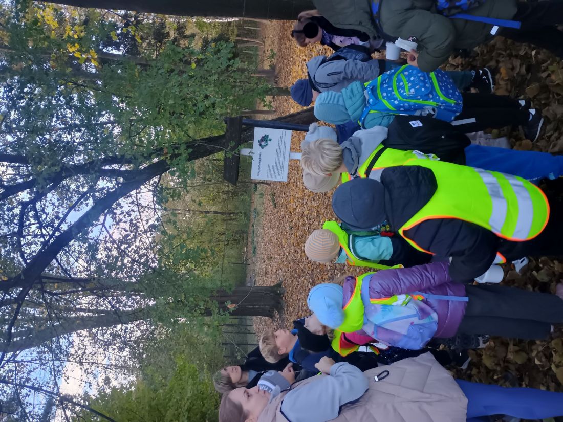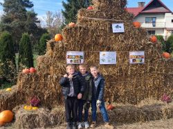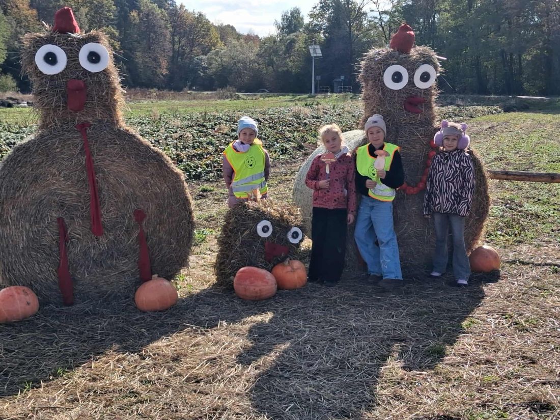Następnie uczniowie udali się na spacer ścieżką edukacyjną, dzięki której poznali lecznicze właściwości niektórych drzew. Kolejnym punktem programu było karmienie zwierząt w mini zoo, co dostarczyło dzieciom wielu emocji. Niektórzy uczniowie pokonali swoje lęki i po raz pierwszy mieli bliski kontakt ze zwierzętami. Dzieci mogły karmić daniele, obserwować kolorowe papugi, podziwiać pawia oraz niezwykłego bażanta bananowego. Spotkanie ze zwierzętami sprawiło wszystkim ogromną radość. Później przyszedł czas na warsztaty kulinarne. Uczniowie samodzielnie przygotowywali ciasteczka, wycinając z ciasta jesienne kształty. Gdy wypieki trafiły do piekarnika, dzieci udały się na farmę dyniową, gdzie czekało na nie wiele atrakcji. Podziwiały różne gatunki i odmiany dyń, jabłek, cukinii, zbóż i ziół – wszystkie pięknie opisane i ułożone w malownicze kompozycje. Duże wrażenie zrobiły także ogromne postacie i zwierzęta wykonane ze słomy, które wprowadziły wszystkich w bajkowo-jesienny nastrój. W ich otoczeniu dzieci spędziły miło czas na wspólnych zabawach i pląsach.