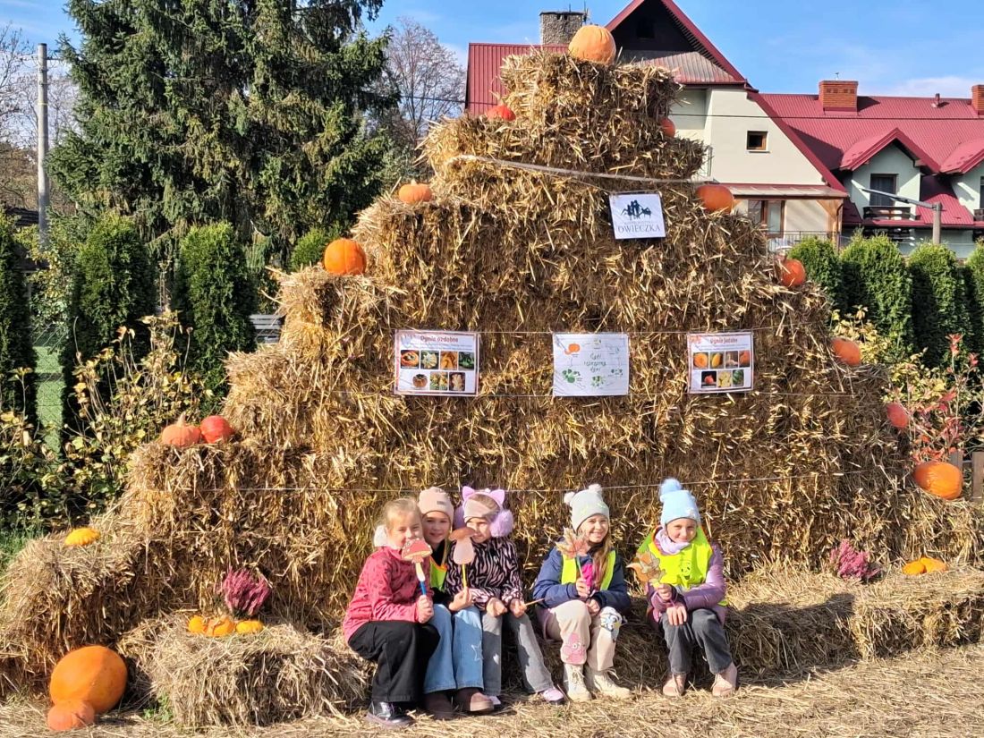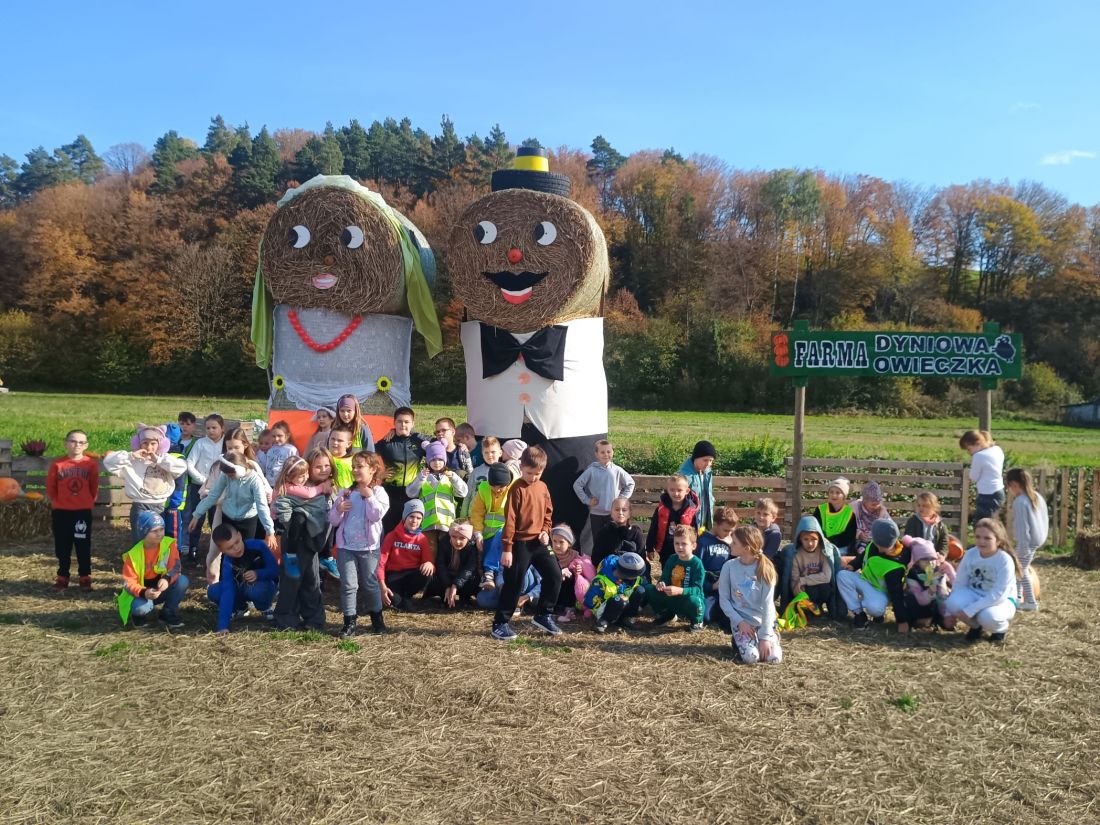 21 października 2025 r. uczniowie klas 0–3 wybrali się pieszo do pobliskiego Gospodarstwa Agroturystycznego „Owieczka”, gdzie odwiedzili wyjątkową „Farmę dyniową”. Na początku wzięli udział w pogadance o jesieni i jej darach. Dowiedzieli się, jakie owoce, warzywa i inne skarby przynosi ze sobą ta piękna pora roku. Z entuzjazmem dzielili się też własnymi spostrzeżeniami o zmianach zachodzących w przyrodzie – opowiadali o kolorowych liściach, kasztanach, dyniach i jabłkach.