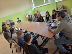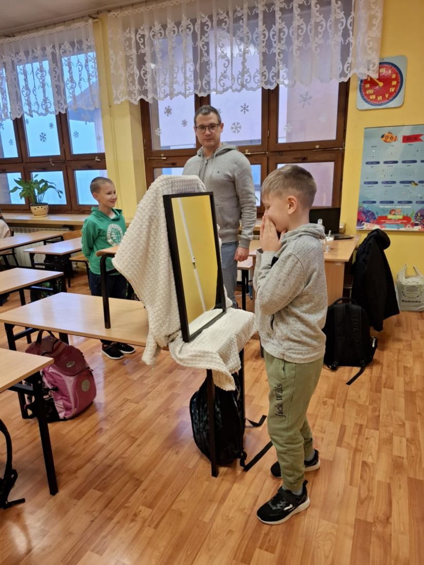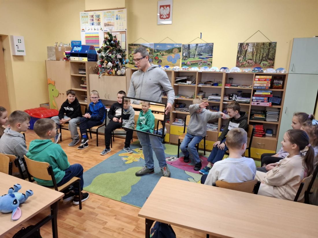 Pierwszą grupą uczestniczącą w warsztatach byli uczniowie klasy II, którzy realizowali temat: „Budowanie relacji w zespołach klasowych w warunkach edukacji stacjonarnej”. Zajęcia rozpoczęły się od ćwiczenia z zakresu autoprezentacji – każde dziecko przedstawiało się, opowiadało o swoich marzeniach oraz o tym, co lubi robić w wolnym czasie. Był to ważny element integrujący grupę oraz budujący poczucie bezpieczeństwa. We wstępie uczniowie zostali zaproszeni do rozwiązania zagadki – mieli zajrzeć pod ukryty obraz, wiedząc, że zobaczą tam „fajną osobę”. Ku ich zaskoczeniu okazało się, że pod obrazem znajdowało się lustro. Ćwiczenie to w znaczący sposób wpłynęło na wzmocnienie samooceny uczniów, uświadamiając im ich wartość i wyjątkowość. Kolejnym elementem były ćwiczenia rozwijające współpracę, m.in. tworzenie „rąk jako pajęczyny” i wspólne planowanie jej ułożenia za pomocą rozmowy i porozumienia. Następnie przeprowadzono ćwiczenie „minuta ciszy”, podczas którego dzieci mogły doświadczyć, jak cisza wpływa na emocje i wyciszenie organizmu. Był to istotny element nauki radzenia sobie ze złością i napięciem emocjonalnym. W trakcie zajęć pojawiła się również bajka terapeutyczna, ukazująca, że rozmowa i dzielenie się przeżywanymi trudnymi emocjami jest formą pomocy i wsparcia.