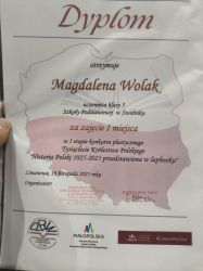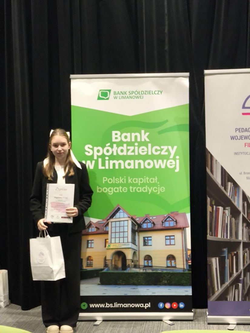 19 listopada 2025 r. w Limanowej odbyło się uroczyste podsumowanie pierwszego etapu konkursu plastycznego: „Historia Polski 1025-2025 przedstawiona w lapbooku”, zorganizowanego przez Pedagogiczną Bibliotekę Wojewódzką w Nowym Sączu Filię w Limanowej, w związku z obchodami 1000-lecia Królestwa Polskiego. Uczestniczyły w nim uczennice klas V, VI i VII naszej szkoły. Wszystkie przygotowane przez nie prace charakteryzowały się wysokim poziomem artystycznym i poprawnością merytoryczną. Wyrazy szczególnego uznania kierujemy do uczennicy klasy V – Magdaleny Wolak, której praca: „Kazimierz III Wielki 1310-1370” zajęła pierwsze miejsce w kategorii klas IV-VI i będzie reprezentować naszą szkołę w ramach etapu finałowego.
