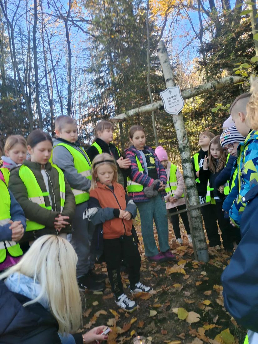 31 października 2025 r. uczniowie klas II i III, zgodnie z coroczną tradycją, udali się do pobliskiego lasku w Świdniku, gdzie znajduje się grób nieznanego żołnierza niemieckiego. Z szacunkiem i powagą pomodlili się w jego intencji oraz zapalili znicze, oddając w ten sposób hołd wszystkim poległym w czasie I i II wojny światowej.