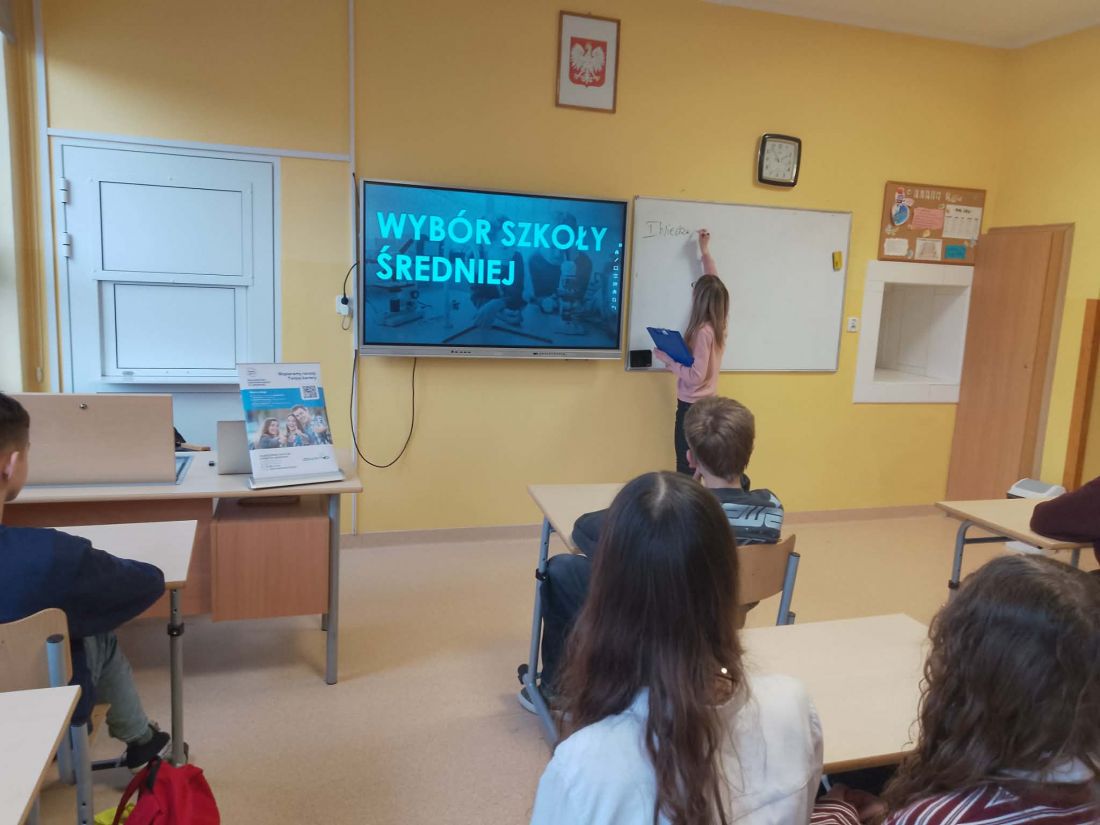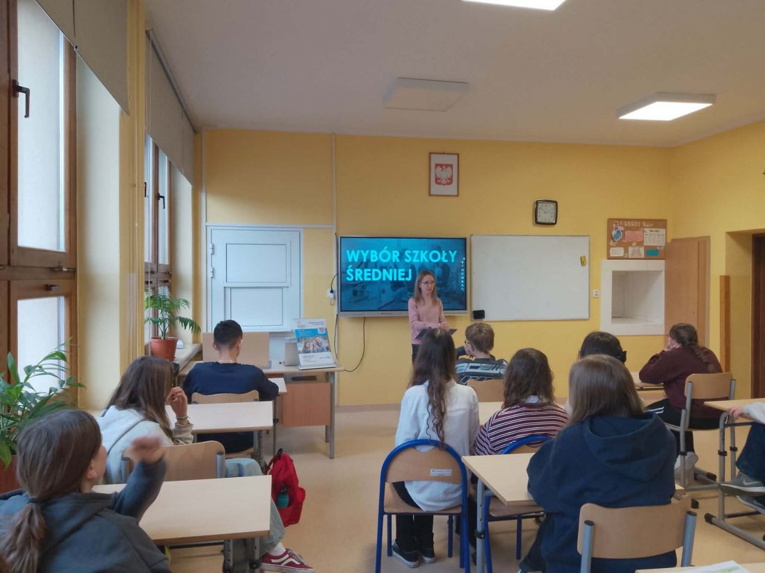 Spotkanie miało charakter aktywny – uczniowie chętnie uczestniczyli w dyskusji, dzielili się swoimi doświadczeniami i refleksjami, a także zadawali pytania. Dzięki temu zajęcia były nie tylko źródłem wiedzy, ale również okazją do wymiany poglądów i rozwijania świadomości dotyczącej przyszłości edukacyjnej. Udział w spotkaniu z doradcą zawodowym z Młodzieżowego Centrum Kariery z pewnością przyczynił się do lepszego przygotowania uczniów do podjęcia jednej z pierwszych ważnych decyzji w ich życiu – wyboru dalszej drogi kształcenia.
