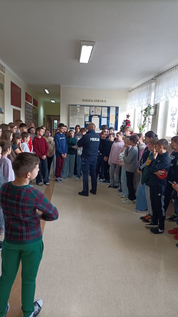 16 grudnia 2025 roku uczniowie klas I–VII uczestniczyli w spotkaniu z panem policjantem z Posterunku Policji w Łukowicy. Celem spotkania było zwrócenie uwagi na bezpieczeństwo dzieci i młodzieży poruszających się po drogach – zarówno pieszo, jak i na rowerach oraz hulajnogach. Podczas rozmowy policjant przypomniał podstawowe zasady bezpiecznego poruszania się po jezdni i chodnikach, omówił obowiązujące przepisy oraz najczęstsze zagrożenia, z jakimi mogą spotkać się uczniowie w drodze do szkoły i poza nią. Szczególną uwagę zwrócono na znaczenie elementów odblaskowych i kamizelek, które znacznie poprawiają widoczność i mogą uratować zdrowie, a nawet życie. Uczniowie dowiedzieli się, jak ważne jest dostosowanie prędkości do warunków na drodze, unikanie korzystania z telefonu podczas jazdy oraz noszenie kasków ochronnych. Spotkanie miało charakter profilaktyczny i było okazją do zadawania pytań oraz dzielenia się własnymi doświadczeniami. Zdobyta wiedza z pewnością przyczyni się do zwiększenia bezpieczeństwa uczniów w codziennych sytuacjach.