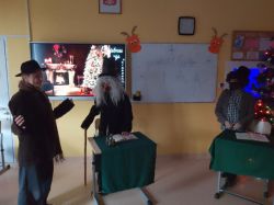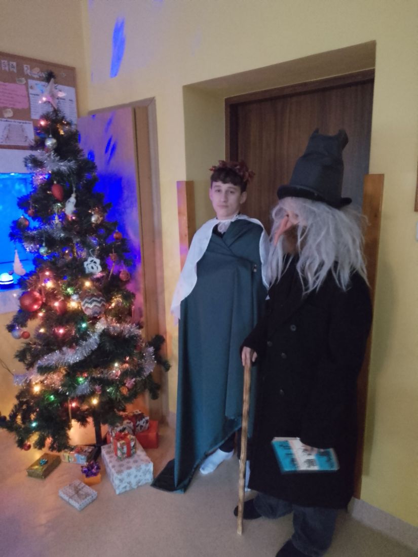 Uczniowie z dużym zaangażowaniem i samodzielnością przygotowali całe przedsięwzięcie – opracowali scenariusz, stworzyli nastrojową scenografię, zadbali o odpowiednie kostiumy oraz oprawę muzyczną, która doskonale podkreślała klimat przedstawienia. Całość wprowadziła widzów w prawdziwie bożonarodzeniowy nastrój, pełen refleksji i wzruszeń. Występ przypomniał ważne przesłanie lektury – że każdy człowiek ma szansę na przemianę, a empatia, dobroć i wrażliwość na potrzeby drugiego człowieka są wartościami ponadczasowymi. Historia Ebenezera Scrooge’a stała się dla młodych aktorów i widzów okazją do zastanowienia się nad tym, co w życiu naprawdę ważne.