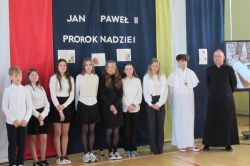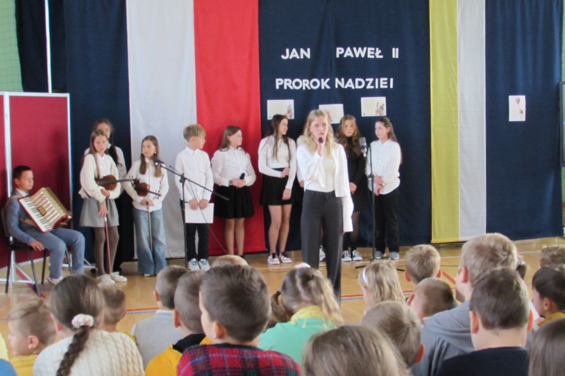 We czwartek, 16 października 2025 r., w naszej szkole obchodziliśmy XXV Dzień Papieski, którego tegorocznym hasłem było: „Św. Jan Paweł II – Prorok Nadziei”. Z tej okazji w sali gimnastycznej odbyła się uroczystość przygotowana przez uczniów klas VI-VIII.. Młodzież zaprezentowała wzruszające przedstawienie, w którym poprzez słowo i muzykę przybliżyła najważniejsze momenty pontyfikatu św. Jana Pawła II. Występ był pięknym przypomnieniem o jego przesłaniu pełnym wiary, nadziei i miłości, które do dziś pozostaje aktualne.