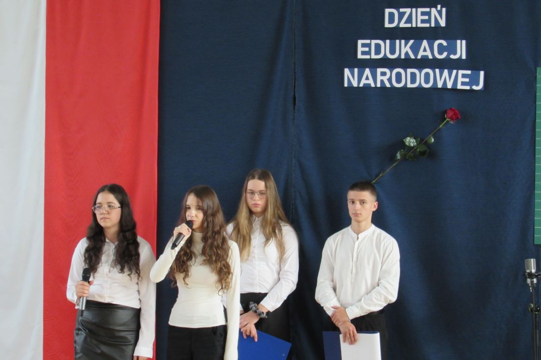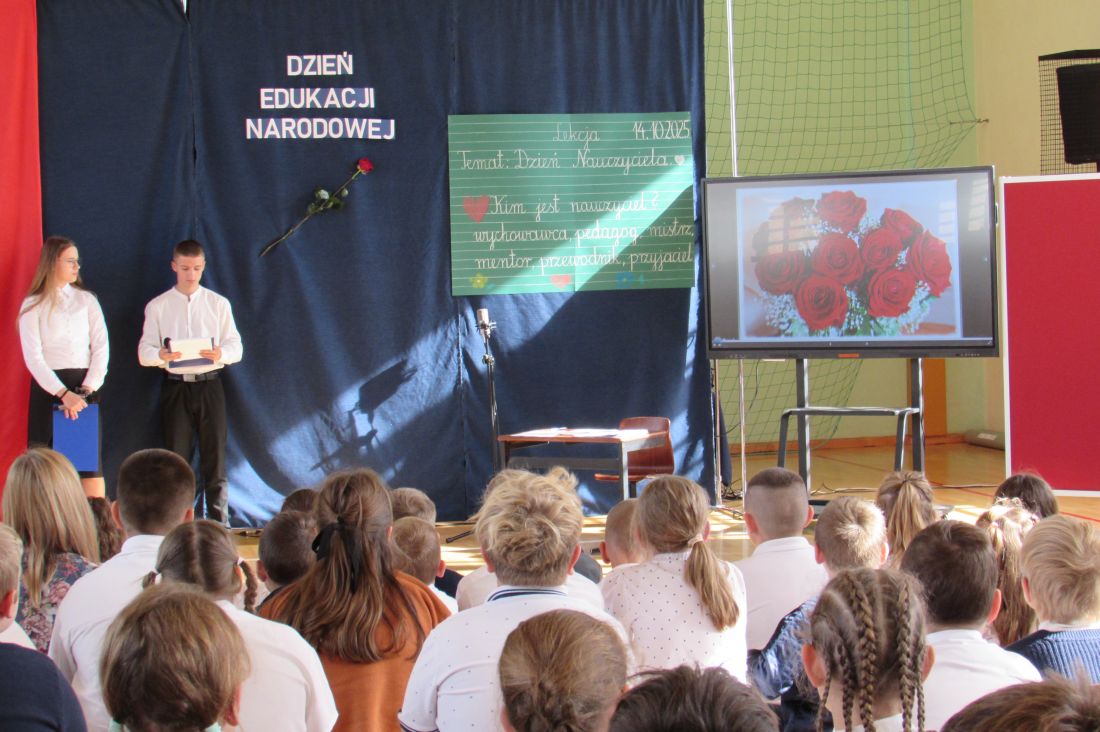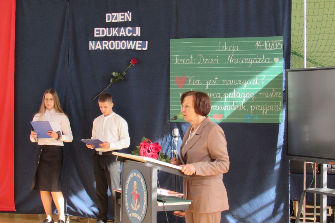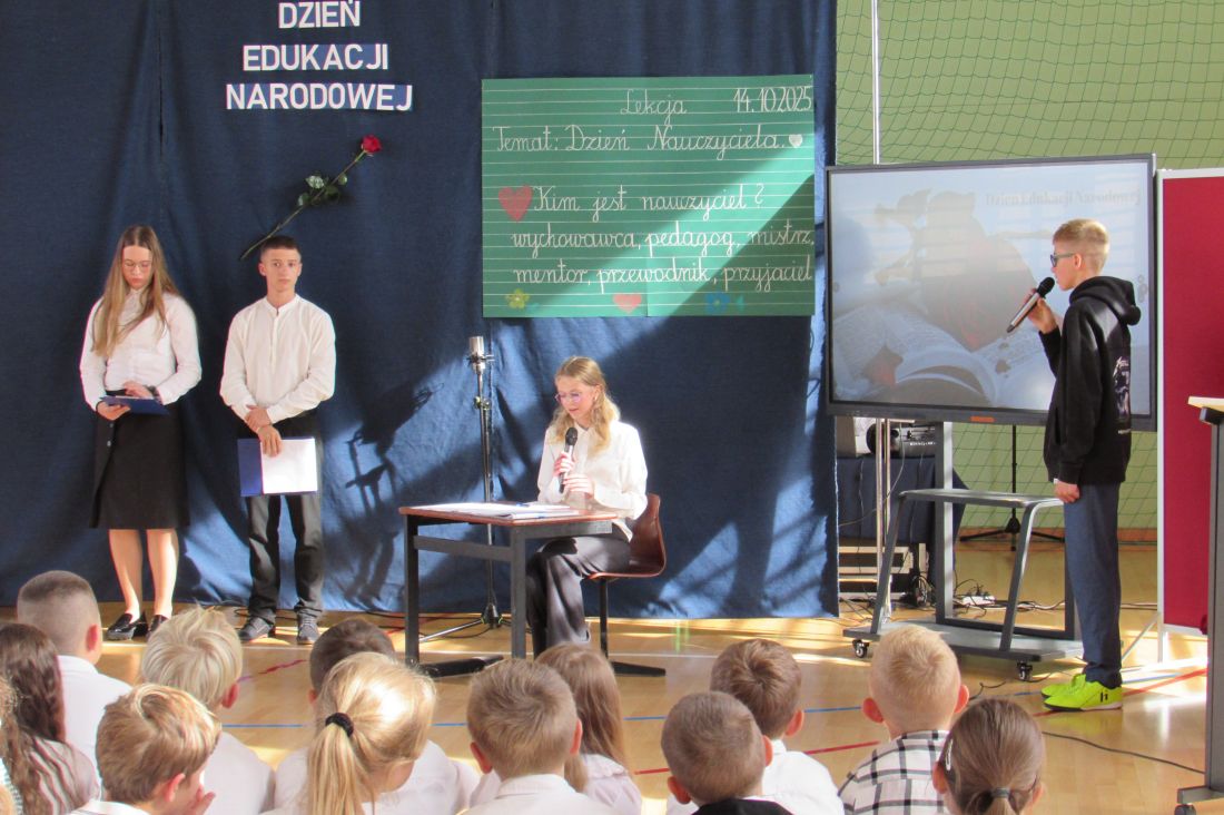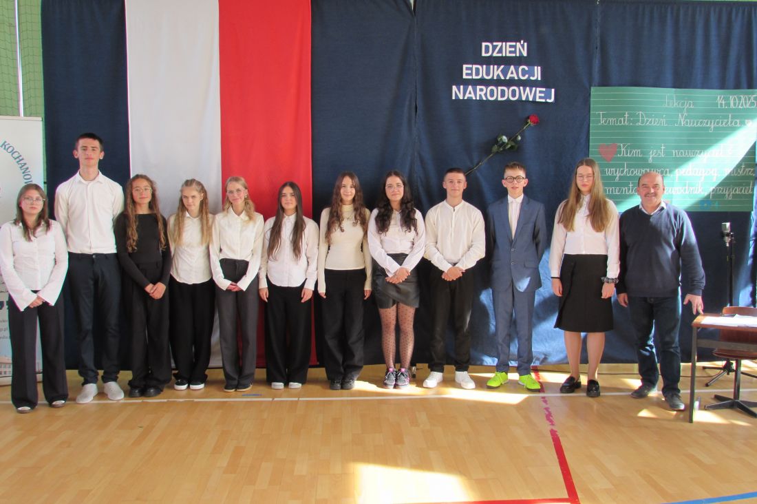 13 października 2025 r. w naszej szkole odbyły się uroczyste obchody Dnia Edukacji Narodowej. To wyjątkowe święto było okazją do wyrażenia wdzięczności wszystkim nauczycielom – zarówno tym, którzy obecnie pracują z młodzieżą, jak i tym, którzy już zakończyli swoją zawodową drogę. W akademii udział wzięli także emerytowani nauczyciele, którzy co roku licznie i chętnie uczestniczą w szkolnych obchodach tego ważnego dnia. Ich obecność była dla nas ogromnym zaszczytem oraz przypomnieniem o wieloletnim wkładzie w edukację kolejnych pokoleń uczniów. Okolicznościowy program słowno-muzyczny przygotowali uczniowie klasy VIII wraz z wychowawcą. Występ był wyrazem uznania i szacunku dla pracy pedagogów oraz pięknym gestem podziękowania za ich codzienny trud, cierpliwość i zaangażowanie.