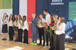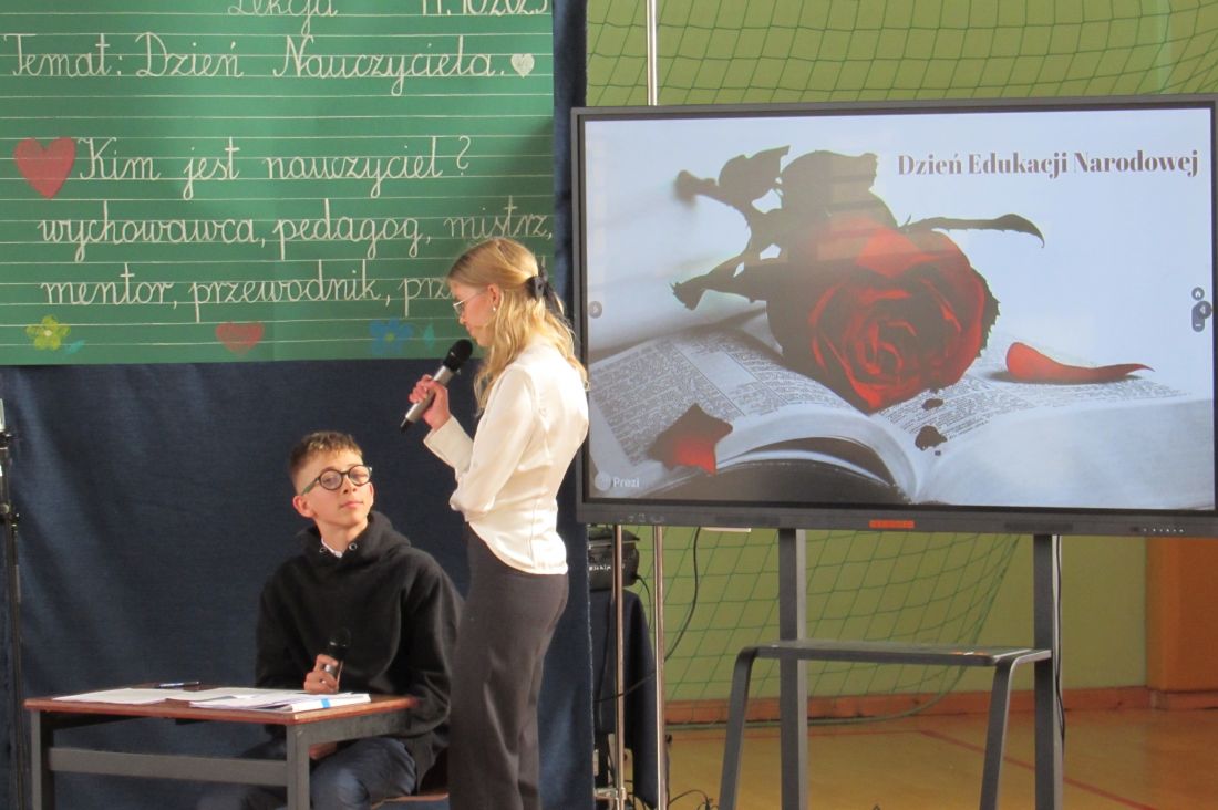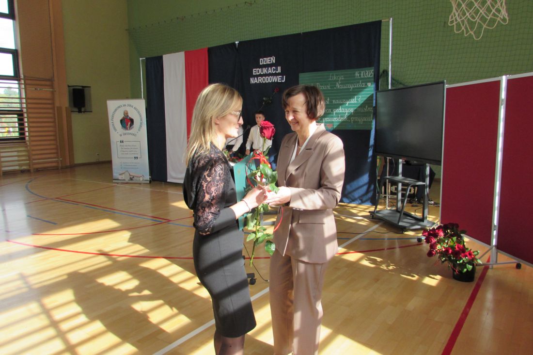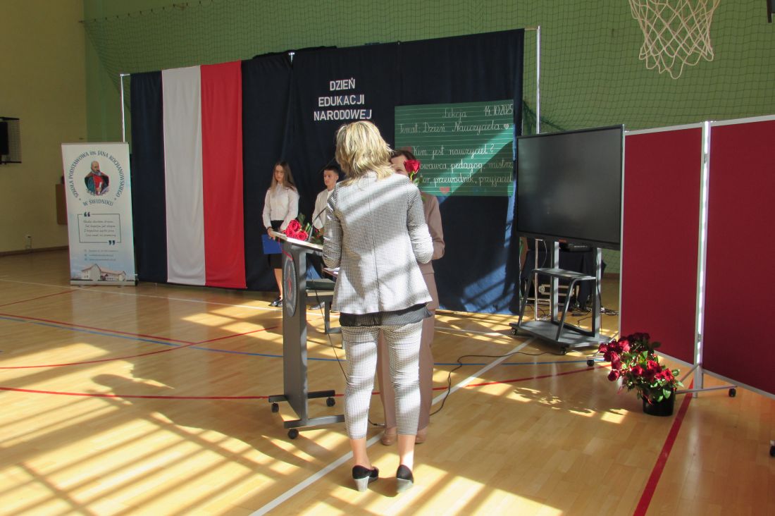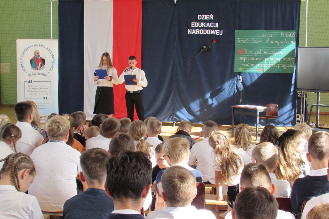13 października 2025 r. w naszej szkole odbyły się uroczyste obchody Dnia Edukacji Narodowej. To wyjątkowe święto było okazją do wyrażenia wdzięczności wszystkim nauczycielom – zarówno tym, którzy obecnie pracują z młodzieżą, jak i tym, którzy już zakończyli swoją zawodową drogę. W akademii udział wzięli także emerytowani nauczyciele, którzy co roku licznie i chętnie uczestniczą w szkolnych obchodach tego ważnego dnia. Ich obecność była dla nas ogromnym zaszczytem oraz przypomnieniem o wieloletnim wkładzie w edukację kolejnych pokoleń uczniów. Okolicznościowy program słowno-muzyczny przygotowali uczniowie klasy VIII wraz z wychowawcą. Występ był wyrazem uznania i szacunku dla pracy pedagogów oraz pięknym gestem podziękowania za ich codzienny trud, cierpliwość i zaangażowanie.