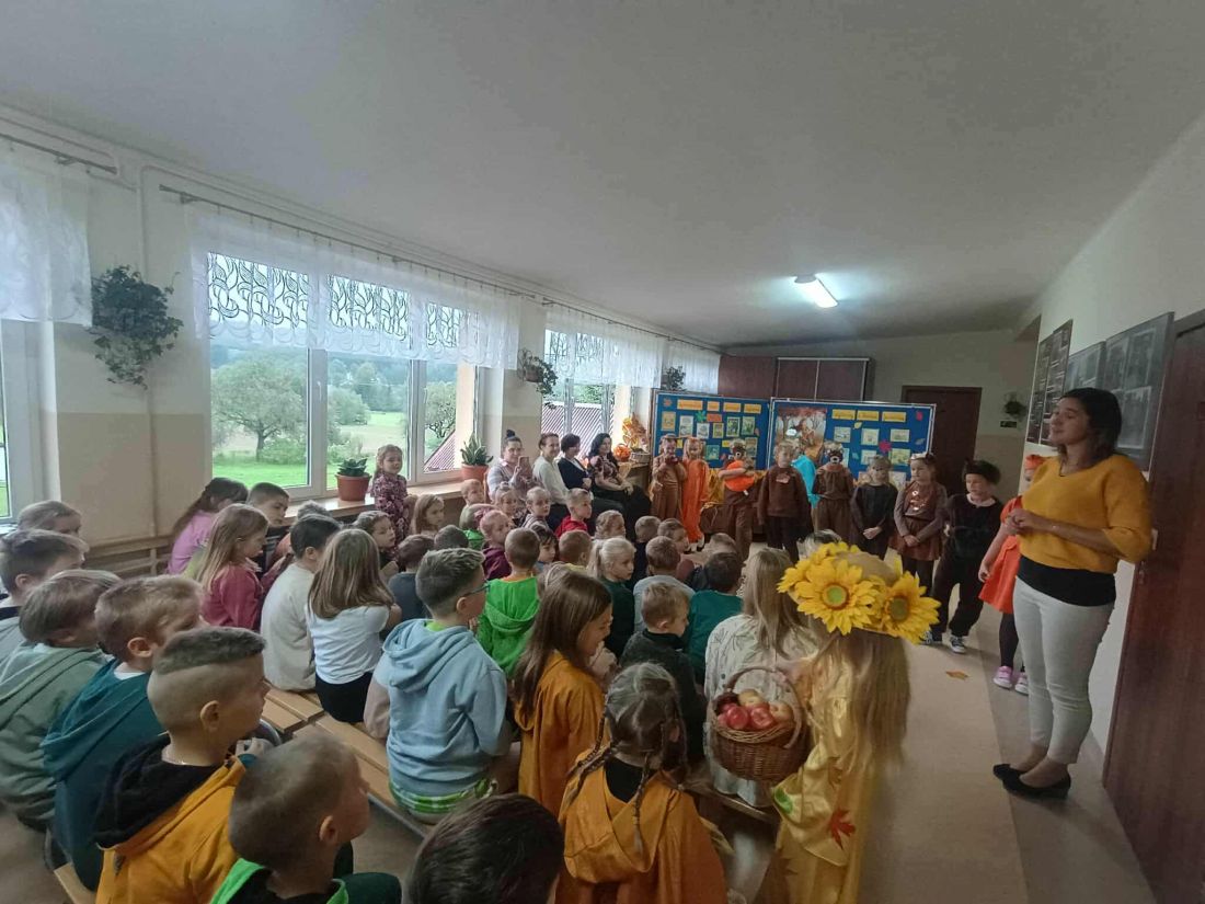30 września 2025 r.w naszej szkole odbyło się wyjątkowe spotkanie z Panią Jesienią. Uroczystość rozpoczęło koło teatralne uczniów klasy drugiej, prowadzone przez panią Władysławę Sułkowską. Dzieci pięknie zaśpiewały piosenkę o Pani Jesieni, a następnie zaprezentowały krótki spektakl. Na scenie pojawiły się barwne postacie – jesienne zwierzątka, w które uczniowie wcielili się z ogromnym zaangażowaniem. Kolorowe stroje, wiersze i radosne piosenki wprowadziły wszystkich w niezwykły, jesienny nastrój.