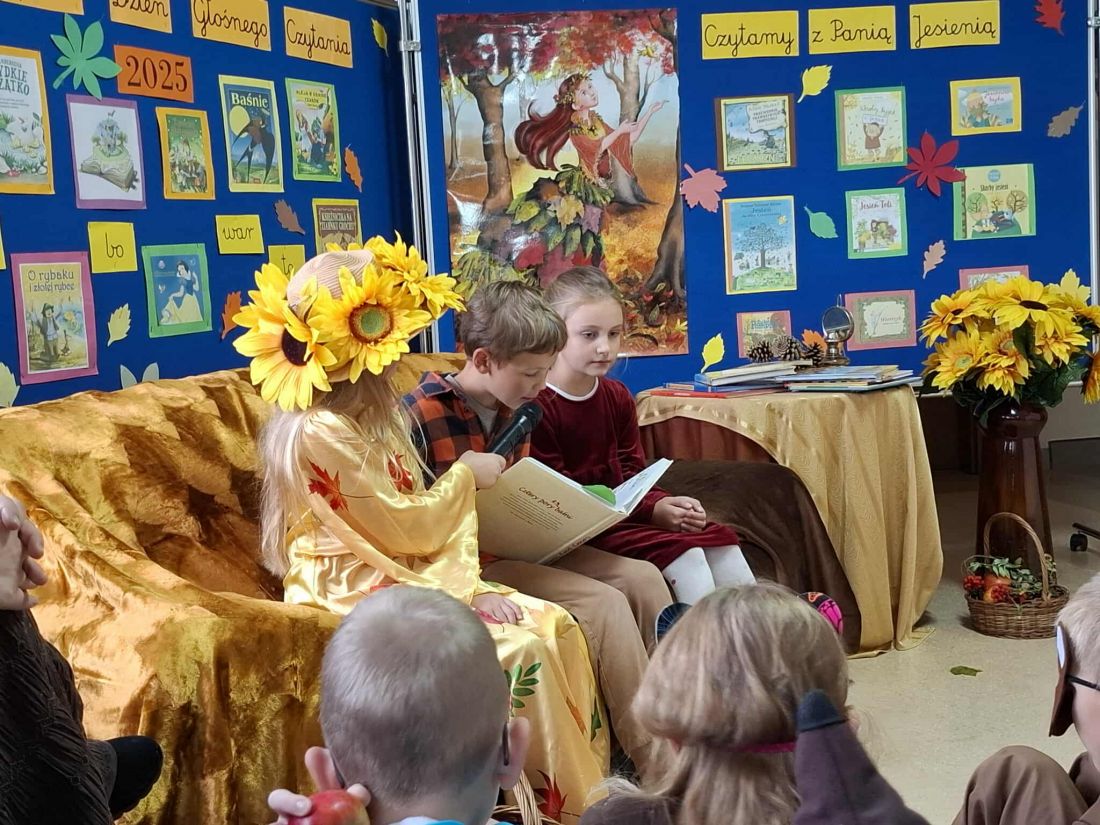 Po części artystycznej uczniowie klas I–III wzięli udział w uroczystym czytaniu. Każda klasa przygotowała opowiadania o tematyce jesiennej. Po przeczytanych tekstach dzieci zadawały pytania, sprawdzając uważność słuchaczy. Pani Jesień nagradzała poprawne odpowiedzi pysznymi, soczystymi jabłuszkami, które były symbolem zdrowia i obfitości tej pory roku. W uroczystości wzięła udział także mama jednej z uczennic klasy drugiej pani Beata Łabuz, która w niezwykle piękny sposób przeczytała jesienne opowiadanie. Uśmiechy na twarzach dzieci świadczyły o tym, jak bardzo cieszyły się z takiej formy zabawy i nauki.
