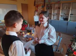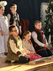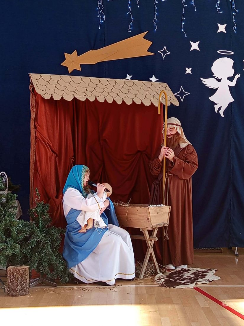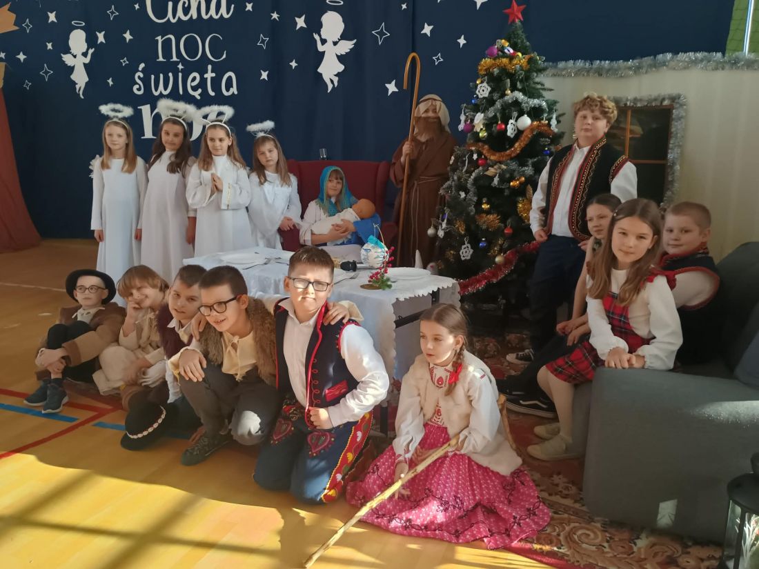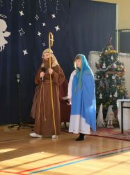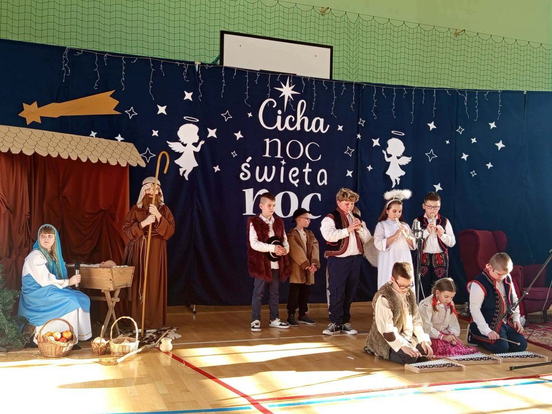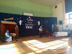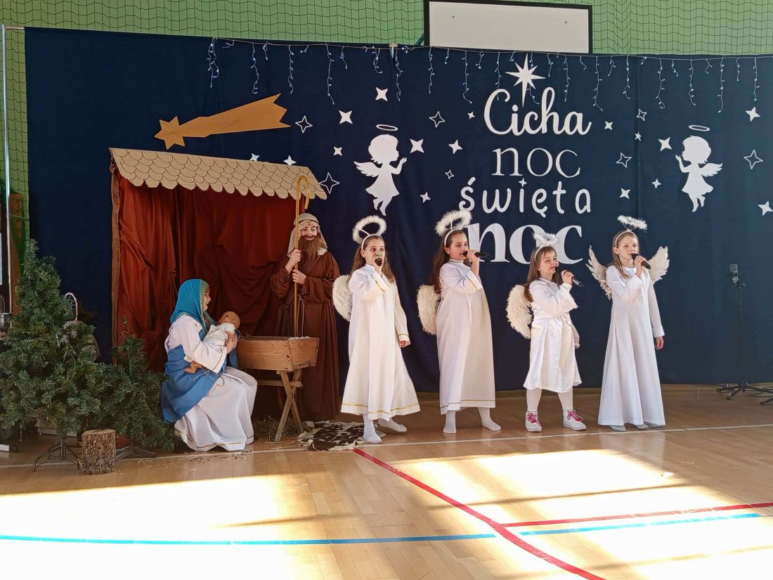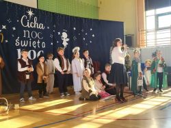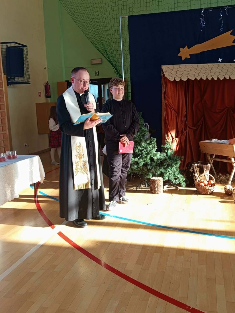 O godzinie 11.00 cała społeczność szkolna wraz z zaproszonymi gośćmi spotkała się w sali gimnastycznej, aby wspólnie rozpocząć dalsze świętowanie. Uroczystość otworzyło piękne, świąteczne przedstawienie przygotowane przez uczniów klasy 3, które wprowadziło wszystkich w bożonarodzeniowy nastrój. Następnie ksiądz Andrzej odczytał fragment Ewangelii opowiadający o narodzeniu Pana Jezusa oraz skierował do zebranych ciepłe, pełne nadziei życzenia świąteczne. Do życzeń dołączyła również Pani Dyrektor, która podziękowała uczniom i nauczycielom za całoroczny trud oraz życzyła wszystkim spokojnych, rodzinnych Świąt Bożego Narodzenia i pomyślności w nadchodzącym roku.